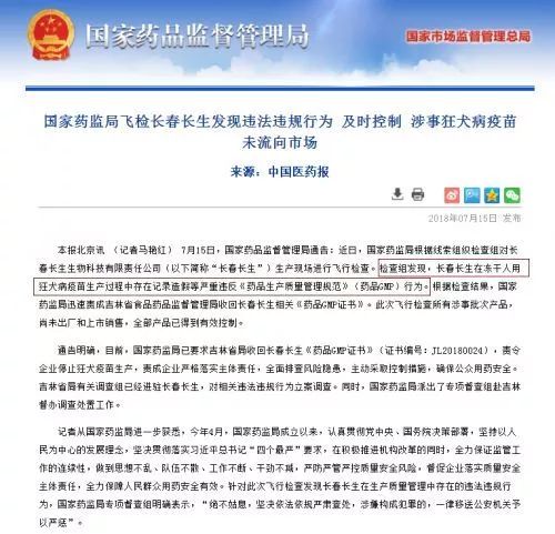 7月18日,吉林省药监局公布,长春长生公司2017年11月生产的25万支百白破疫苗效价不合格,按劣药处理,罚款344万。