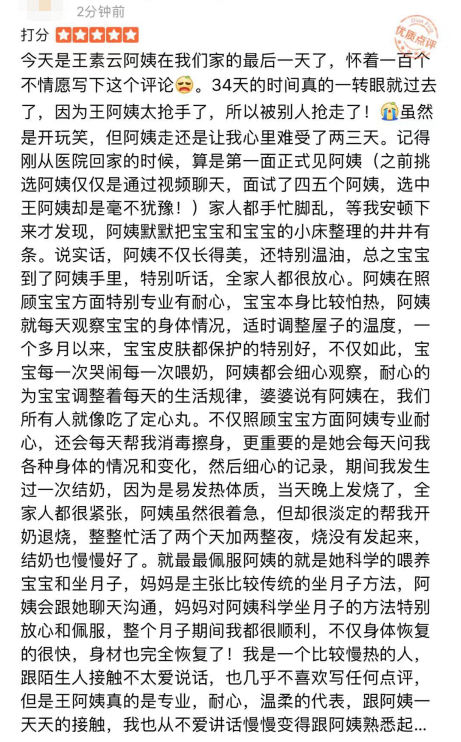服务到一个多月的时候,她突然接到公司的通知,因为她这个级别的另一个月嫂生病,无法提供服务,客户有点不开心。在与她现在的客户协商后,公司决定派她这个王牌月嫂去“救火”。