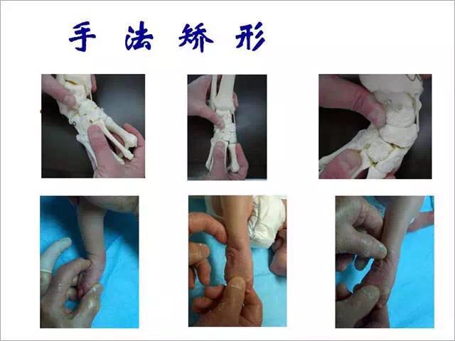 新生儿时期适用手法矫正。手法矫正操作应轻柔,一手固定足跟,另手纠正前足内收,以后依次纠正内翻和马蹄,纠正后用胶布固定维持在纠正后位置。足趾基底和前足部加衬垫,足跟、内踝、膝关节也应加以保护。治疗约需6~10周。