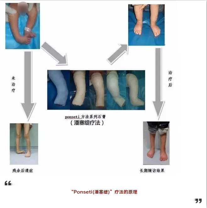 针对先天性马蹄内翻足患儿,目前国际上公认的先天性马蹄内翻足非手术治疗方法是由美国Iowa大学的Ponseti提出的“Ponseti(潘塞缇)”疗法,治疗成功率超过90%,复发率低。该方法简单,有效并且治疗费用低廉,易被儿童及家属接受。