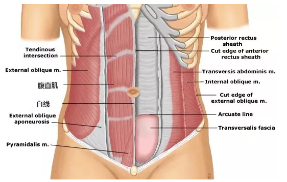 腹直肌是腹部正前方的一块非常强壮的肌肉,起自胸骨剑突和第5、6、7肋软骨,往下止于我们的耻骨联合的地方,整块肌肉被3~4条横行的腱划和中间的白线分成多个肌腹。