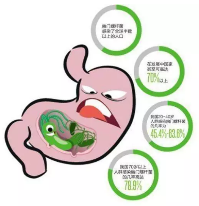世卫组织已经明确,幽门螺杆菌是导致胃溃疡、胃炎和胃癌的第一致病因子。流行病学调查显示,目前中国超过50%~60%的人感染幽门螺杆菌,预计有7亿感染者,也就是说,目前两个人中至少有一个感染者。儿童青少年感染率大约在30%~40%左右,尤其卫生条件差的集体生活的儿童幽门螺杆菌感染率更高。