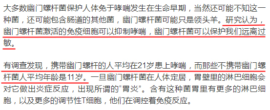有研究显示,儿童期感染幽门螺杆菌,有可能降低人体发生过敏性疾病的风险(如过敏性哮喘)。