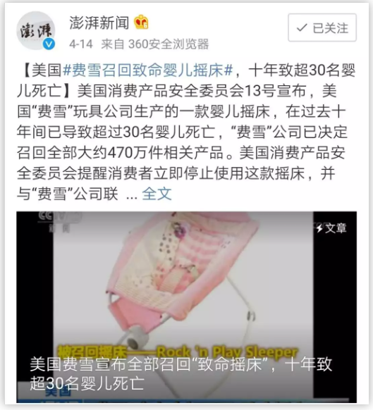 今年四月,美国费雪(Fisher-Price)召回了一款致命婴儿摇床,这款摇床在十年间至少造成了30名婴儿死亡。